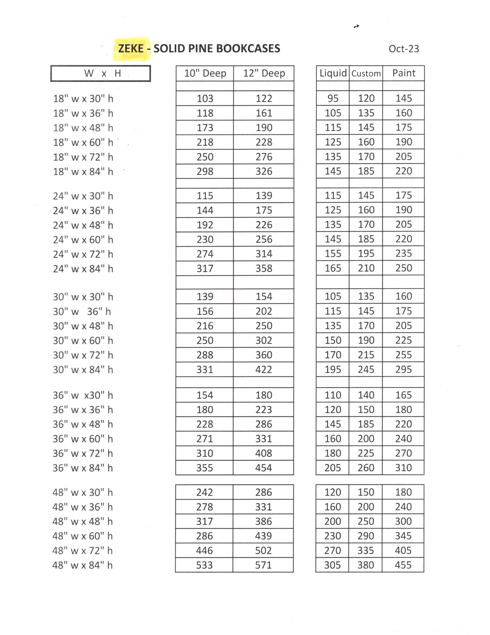 FC Zeke Bookcase Price List