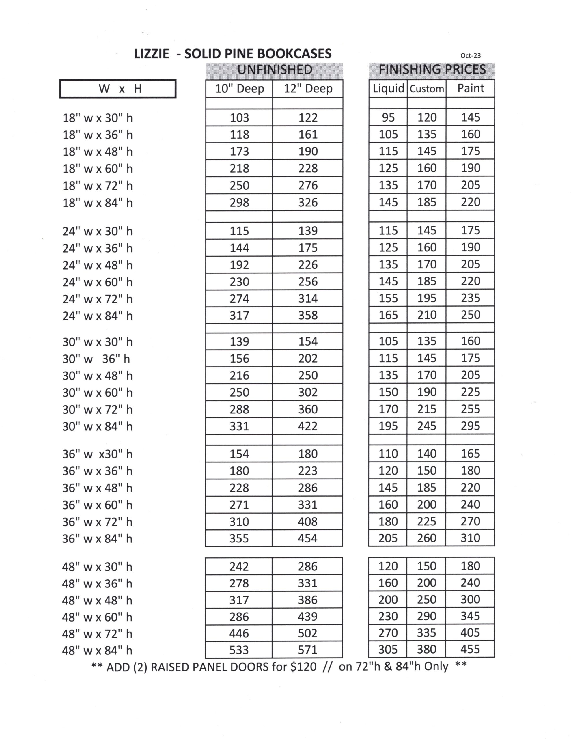Dimensions & Unfinished Pricing: